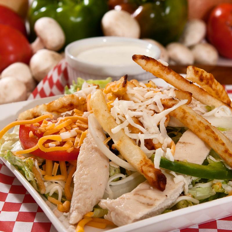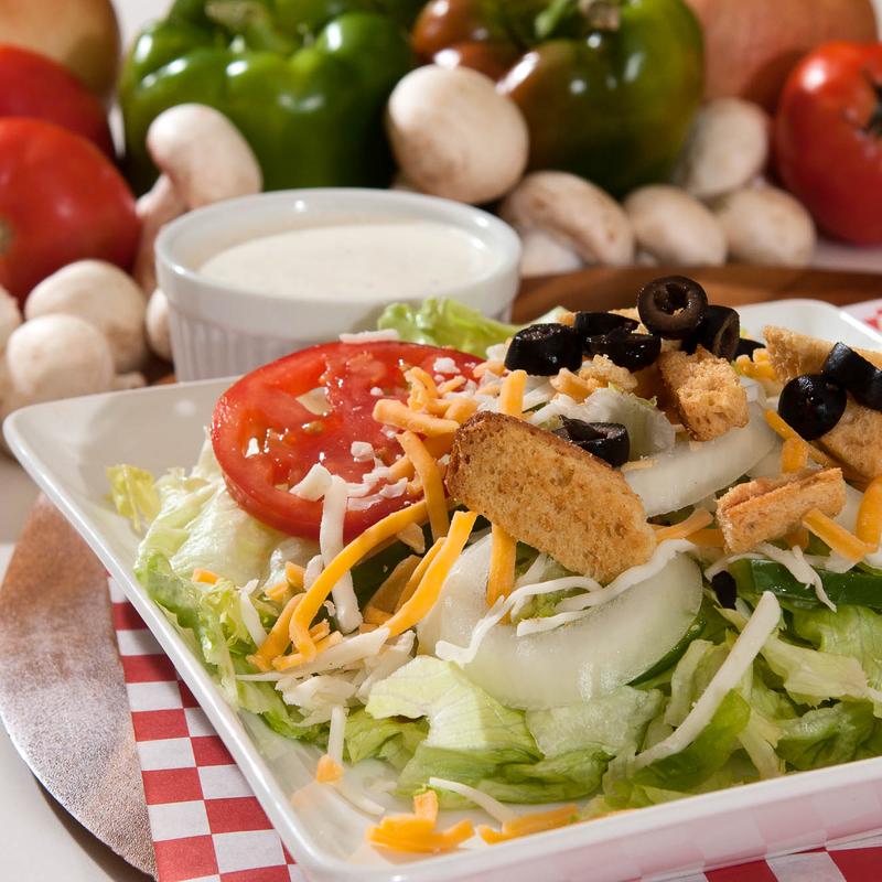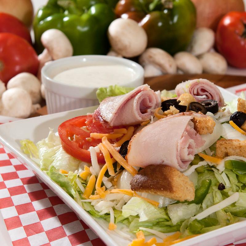 Don’t forget to add a 12 oz bottle of our homemade dressing for an additional charge | Our salads are made with iceberg lettuce, garden vegetables, and a fresh blend of cheeses • Dressings: Homemade Italian | Homemade Ranch | Bleu Cheese | Honey French | Balsamic.
